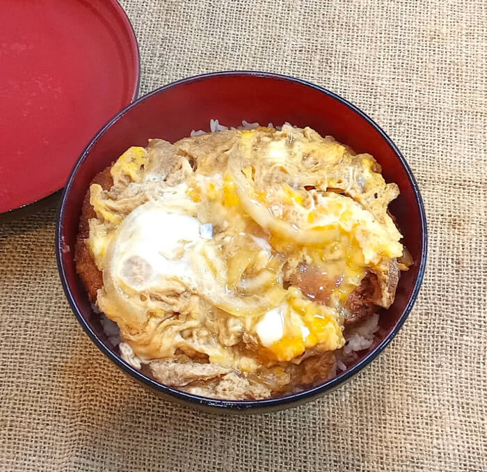 Arroz con escalope de cerdo y huevo. Es en un cuenco de arroz cubierto con un escalope de lomo de cerdo rebozado (Tonkatsu), huevo revuelto y salsa.